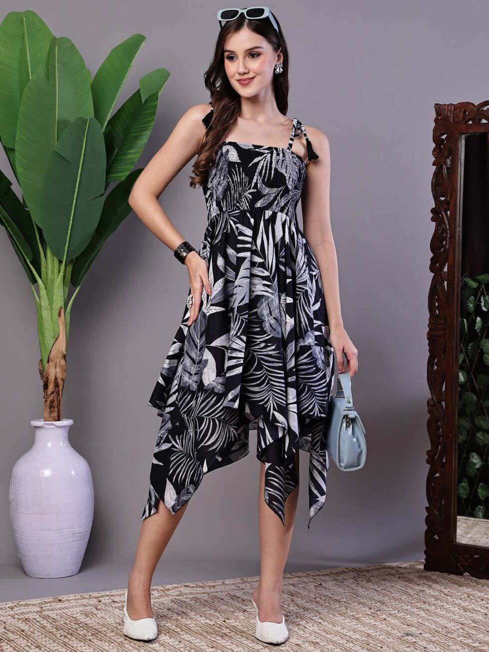 Be the first to review “Women’s Black & White Leaf Print Cotton Handkerchief Hem Dress Midi Dresses”
