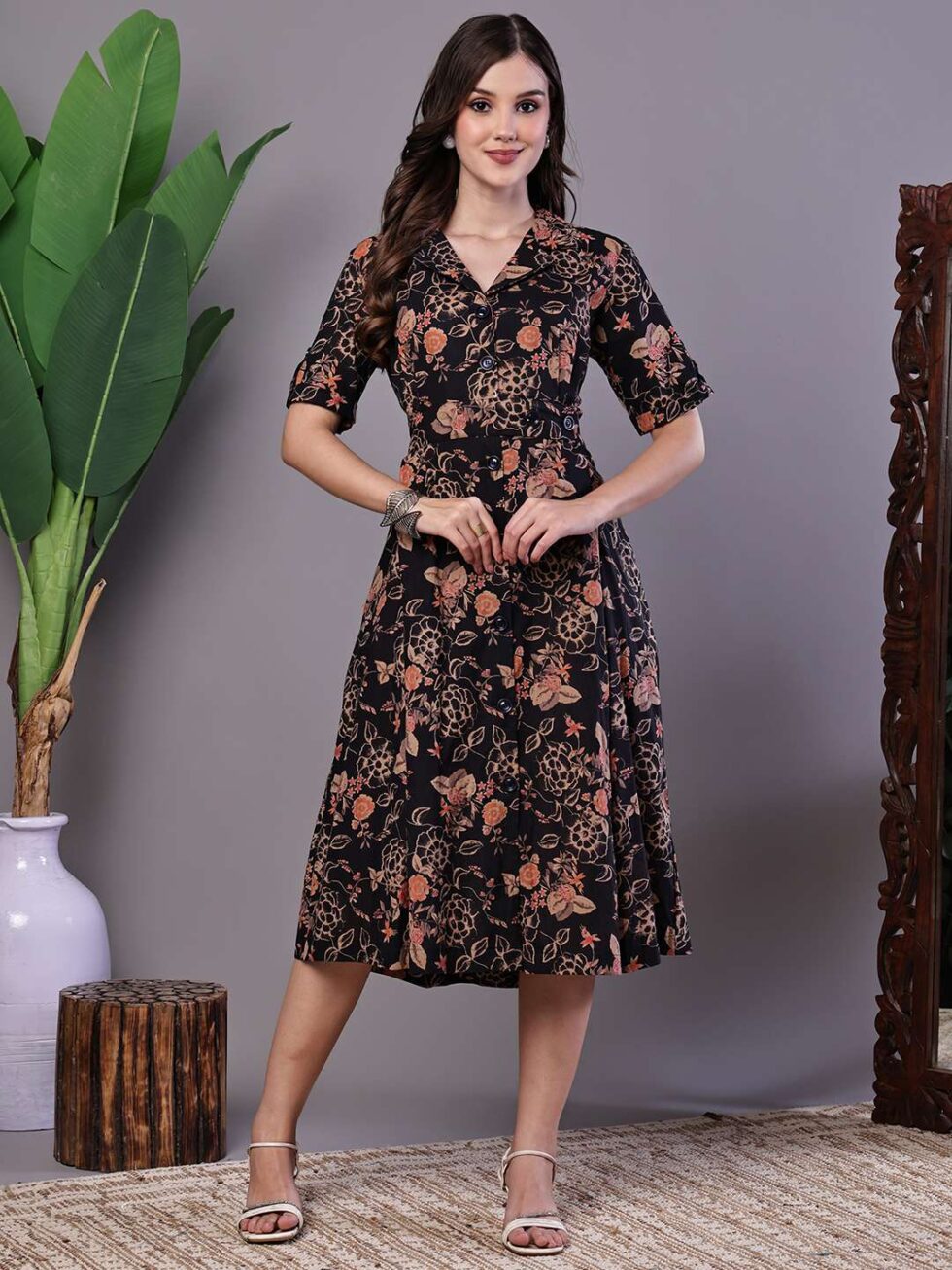 Women’s Chic Black & Rust Floral Print Button-Front Midi Dress